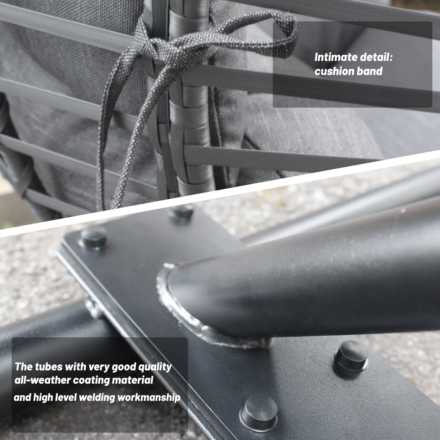 Use better strength cold-rolled tube,the thickness of the main tubes are above 3.5mm to 10mm; UV protected polyethylene resin rattan wrapped, featuring strength and durability, weather resistant, corrosion resistant, odourless and easy to cleanup;10“ thickness soft cushion with high density foam, soft and comfortable; 230g/m2 high quality olefin fabric;