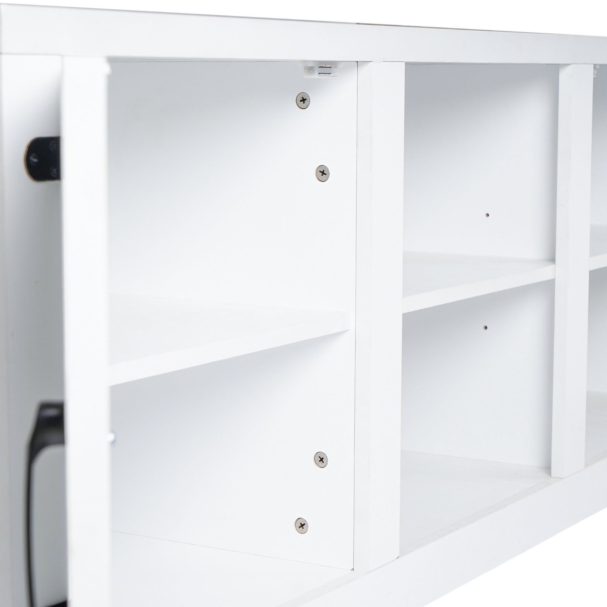 Top surface supports up to 150 Ibs. and shelves support up to 30 Ibs. each. For flat curved screenTVs up to 65"