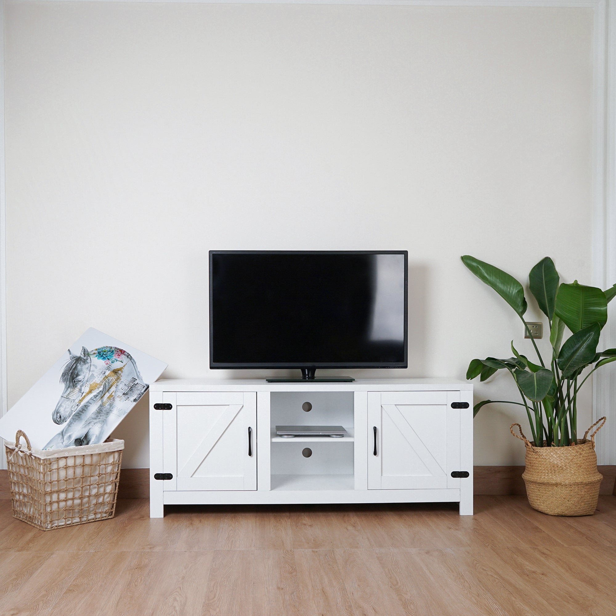 Modern Farmhouse Double Barn Door TV Stand for TVs up to 65 Inches, 58 Inch, White color |